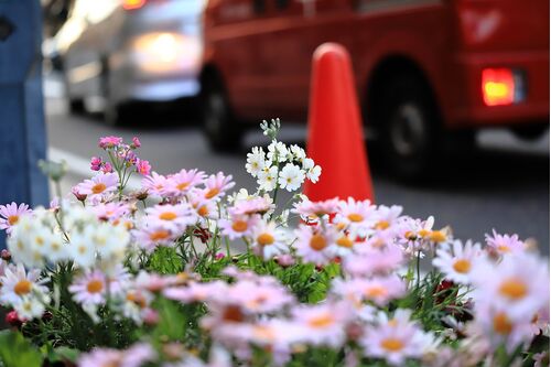ちょうど、赤い車も止まってくれたタイミングで撮ってみました。主題が白い花なので配色的にはいい感じに。カラーコーンがちょっと邪魔でしたね…それともアスファルトの灰色の面積が少なくなるので、ありかな?